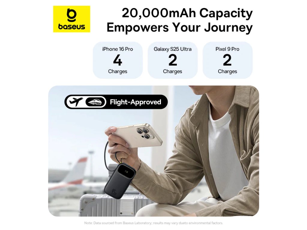 Powerbanka Baseus 20 000 mAh – 45 W s integrovanými kabely USB-C a LightningVysoce výkonná powerbanka 20 000 mAh od Baseus s výkonem až 45 W umožňuje rychlé nabíjení smartphonů, tabletů i některých notebooků. Díky vestavěným kabelům USB-C a Lightning a dalším portům USB-C a USB-A můžete nabíjet až 4 zařízení současně – ideální pro cestování, práci i každodenní použití.