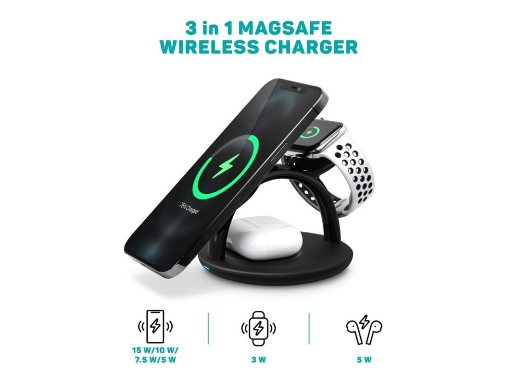 MultiCharge MagSafe 3in1 Wireless Fast Charge bezdrátová magnetická nabíječka. Podporuje až 15 W rychlonabíjení a magnetickým kruhem pro nabíjení iPhone, 3 W Qi nabíjení pro Apple Watch a 5 W nabíjení pro Apple AirPods.