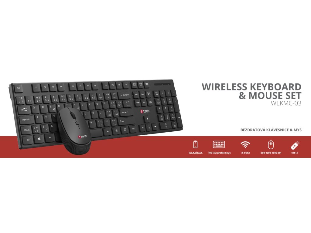 C-TECH WLKMC-03 Bezdrátový set klávesnice a myši pro pohodlnou a efektivní práciBezdrátový set klávesnice a myši C-TECH WLKMC-03 přináší pohodlí a svobodu pohybu bez rušivých kabelů. Díky spolehlivé 2,4GHz bezdrátové technologii získáte stabilní a rychlé připojení s dosahem až 10 metrů, což zajišťuje plynulou práci bez výpadků. Stačí připojit kompaktní USB-A přijímač do portu vašeho počítače a můžete ihned začít pracovat – není potřeba žádná složitá instalace díky technologii Plug & Play.