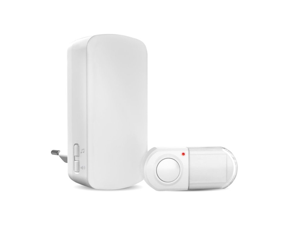 Set obsahuje domácí zvonek (přijímač) do sítě 230 V a tlačítko (vysílač) na baterii 3 V