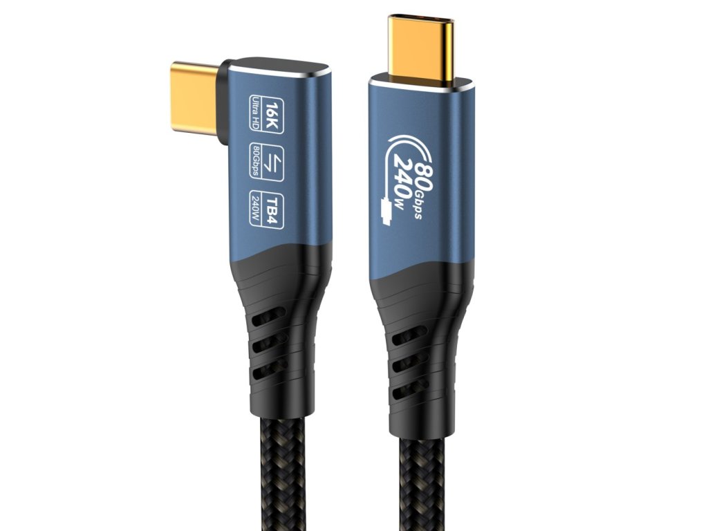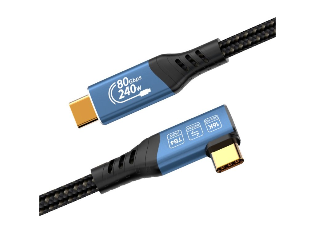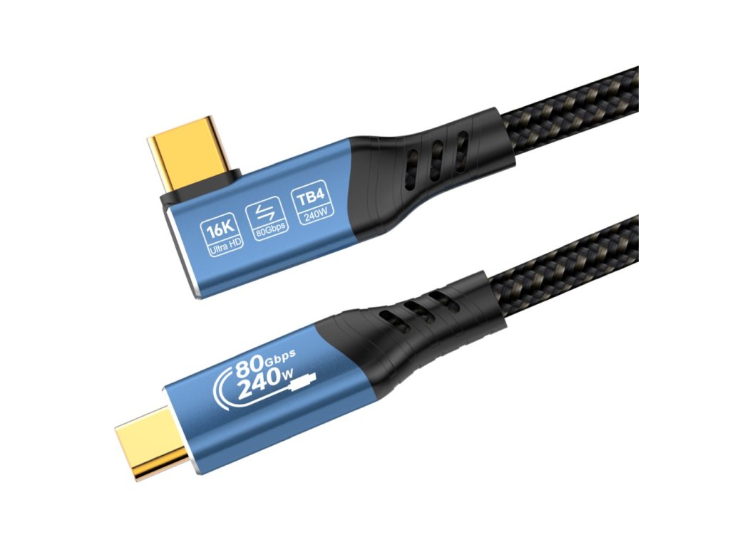 PremiumCord USB4™ Version2.0 80Gbps 16K@60Hz 240W Thunderbolt 3 a 4 kabel zahnutý 90° délka 1,2mTento kabel USB4™ Version2.0 nabízí extrémně vysokou přenosovou rychlost až 80 Gbit/s, takže je ideální pro datově náročné aplikace. Přeneste videa ve vysokém rozlišení až 16K na monitory a televizory, vychutnejte si ostrý obraz a vynikající zvuk.