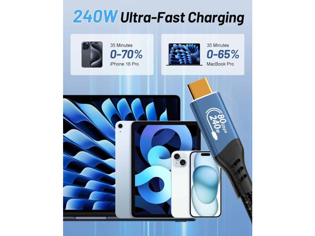 - Bezkonkurenčních 80 Gbit/s zajišťuje bleskově rychlý přenos dat – kabel USB-C je 16x rychlejší než USB 3.0 a ideální pro pevné disky NVMe, HD filmy, seriály, hudbu a fotografie.