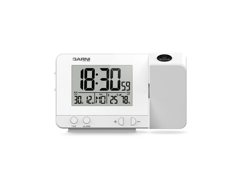 Digitální budík s projekcí času a vnitřní teploty s LCD displejem, časem řízeným rádiovým signálem DCF-77 aměřením vnitřní teploty a relativní vlhkosti
