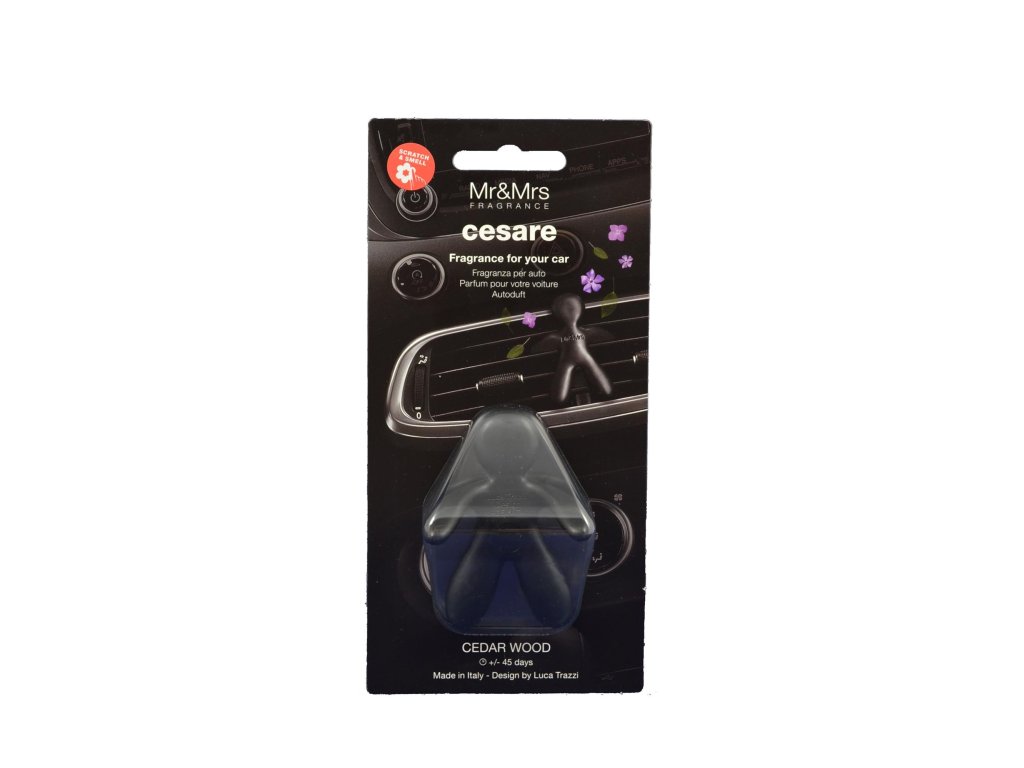 Voňavý panáček Cesare je designová vůně do auta od italského výrobce Mr&Mrs Fragrance. Panáček se za paže připevní na výdech ventilace a prouděním vzduch se z něj uvolňuje vůně po dobu až 45 dní. Cedrové dřevo.Doplňkové parametry