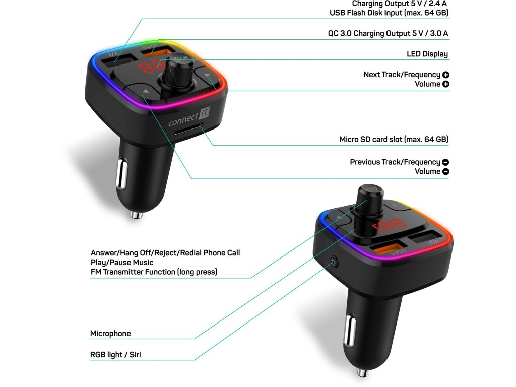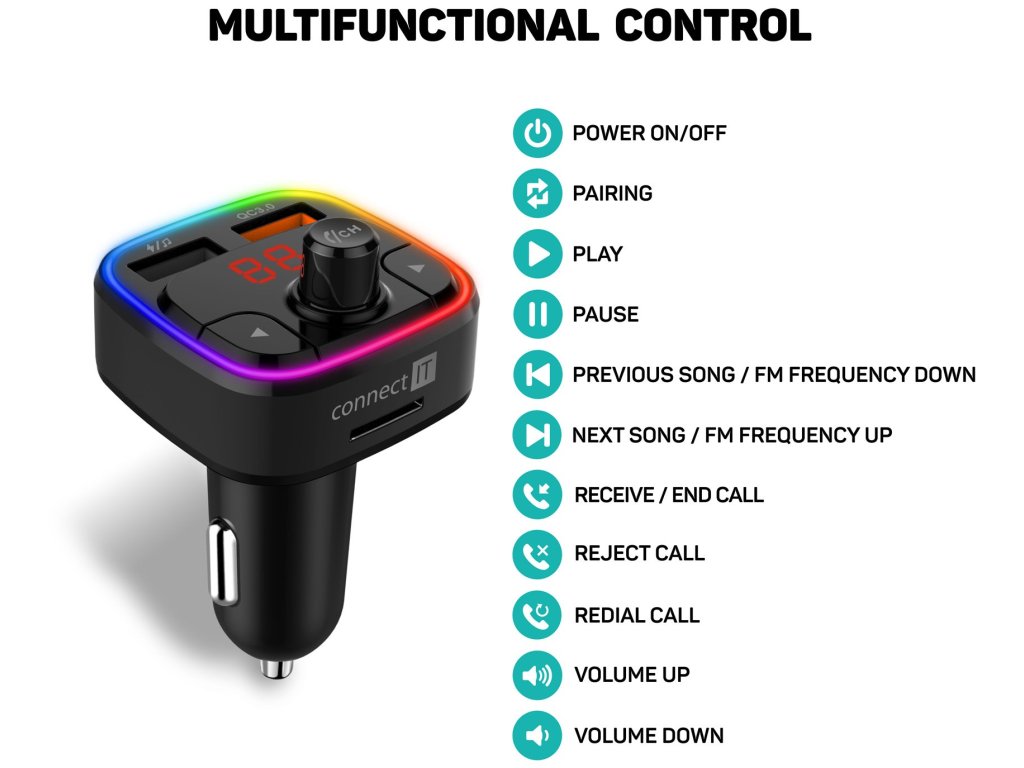 CONNECT IT CarRGB Bezdrátový FM transmitter, 2xUSB+MicroSD, ČERNÝ (CCC-9090-BK)