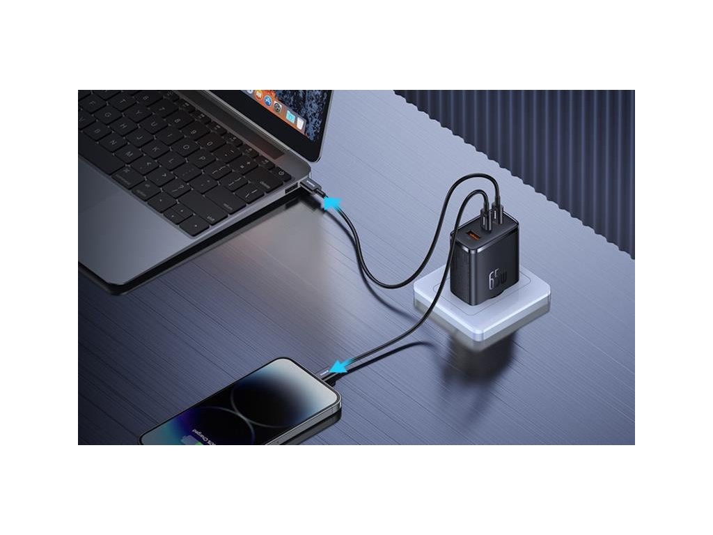 Celkový výkon až 65 W umožňuje nabíjet i výkonnější zařízení, jako jsou notebooky nebo herní konzole.