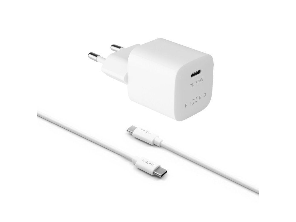 Set síťové nabíječky FIXED Mini s USB-C výstupem a USB-C/USB-C kabelu, podpora PD, 1 metr, 30W, bílý (FIXC30M-CC-WH)
