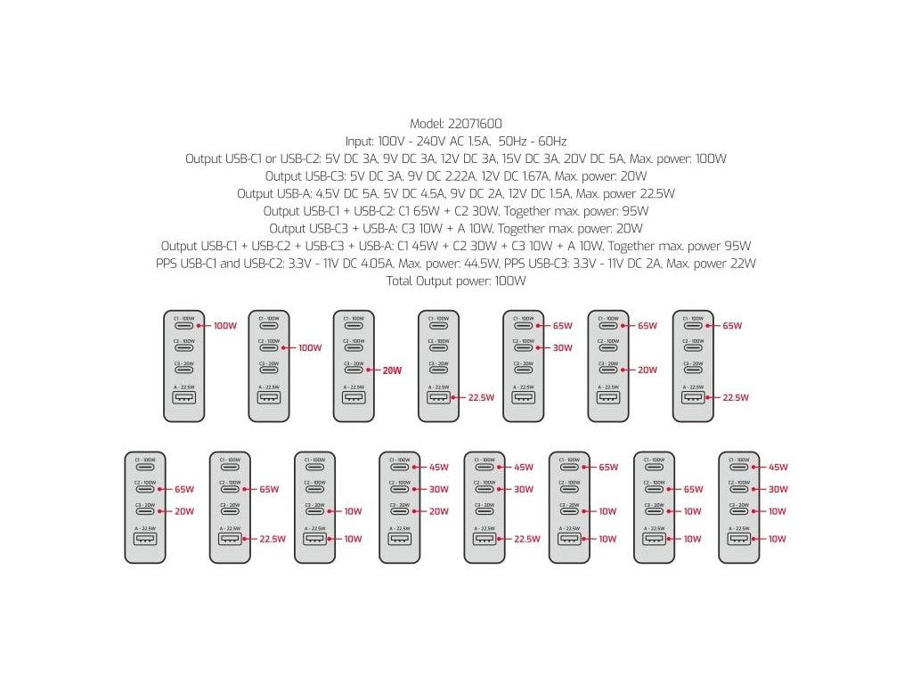 USB-C 1, USB-C 2: DC 5V/3A; 9V/3A; 12V/3A; 15V/3A; 20V/5A; PPS: 3,3–11V/4,05A; max. 100 W