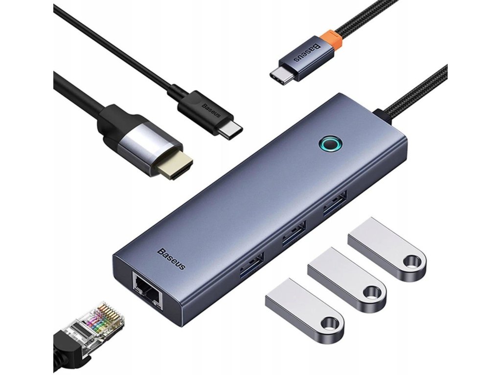 Baseus 6portová dokovací stanice HUBUsnadněte si každodenní práci u počítače. Rozbočovač Baseus UltraJoy 6 v 1 je vybaven 3 porty USB 3.0 pro přenos dat rychlostí až 5 Gb/s. Má také port HDMI, který podporuje rozlišení 4K@60 Hz, a konektor RJ45 pro bleskové připojení rychlostí až 1 000 Mb/s. Využijete ho také k nabíjení notebooku nebo smartphonu díky rychlému 100W nabíjení PD. Funguje s celou řadou zařízení a díky kompaktnímu provedení ho můžete mít vždy po ruce.