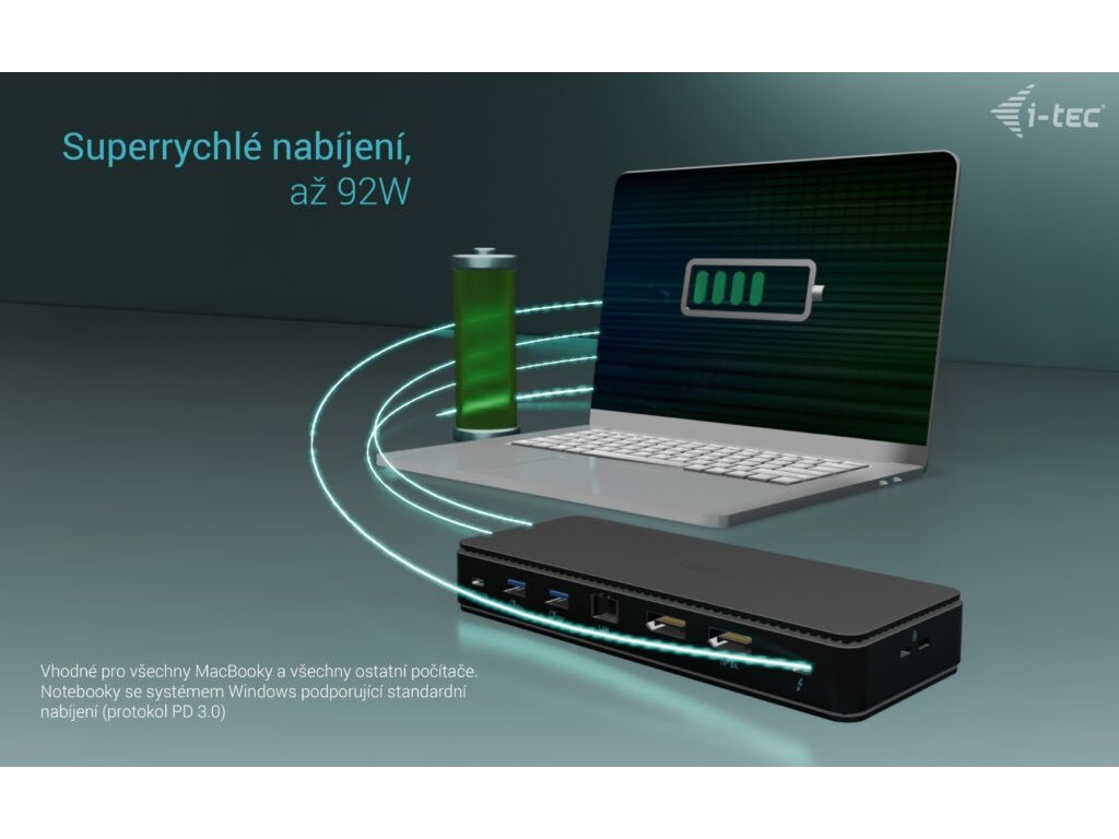 • Poskytuje až 92W Power Delivery pro kompatibilní notebooky a tablety s rozhraním USB4, USB-C a Thunderbolt. Hostitelské zařízení musí podporovat USB-C Power Delivery.