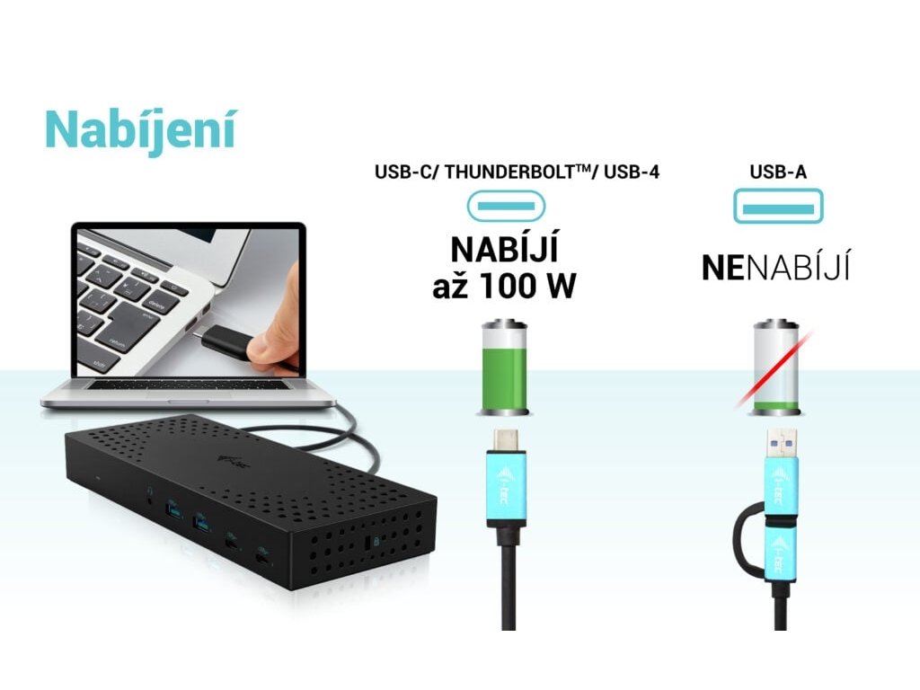 • Dokovací stanice podporuje až 100W napájení připojeného notebooku nebo tabletu (při připojení k příslušnému portu USB-C nebo ThunderboltTM. Při připojení k portu USB 3.0 nelze notebook nabíjet).