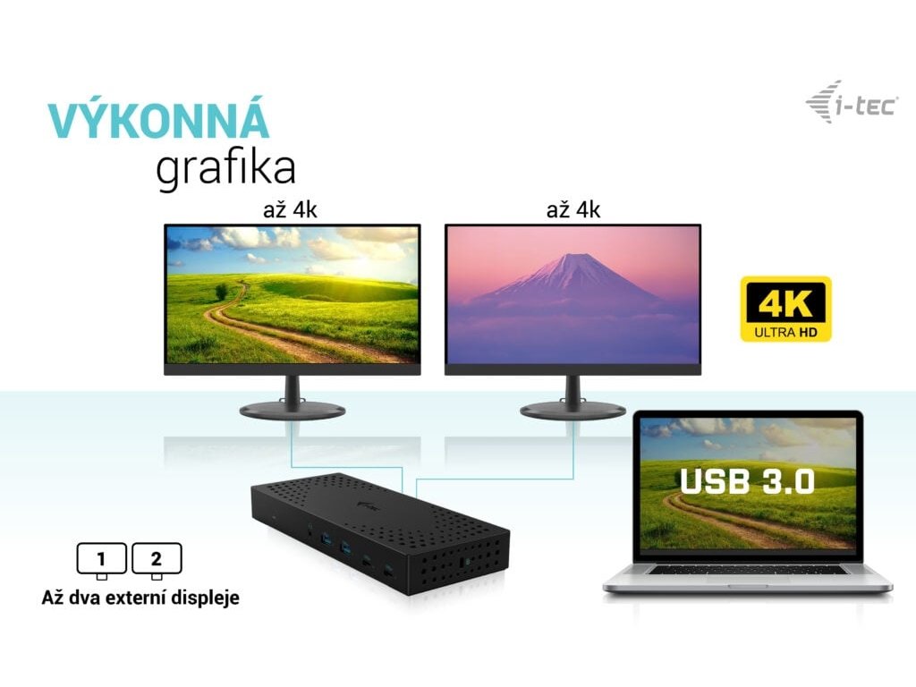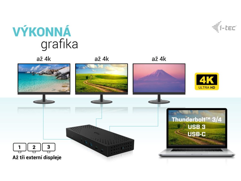 • Maximálně výkonná dokovací stanice až pro tři monitory současně• Dokovací stanice je kompatibilní se všemi moderními notebooky (připojení přes porty USB 3.0, USB-C nebo Thunderbolt™ 3/4).