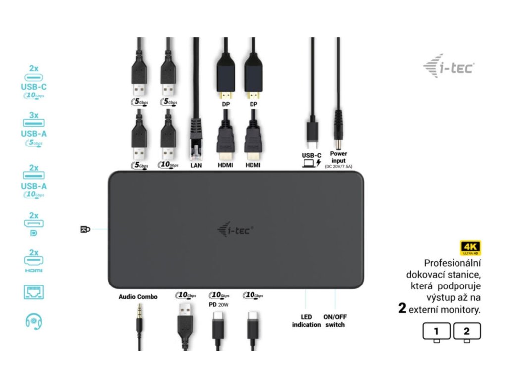 • Výkonná kancelářská dokovací stanice podporující superrychlé porty USB Gen 2 s rychlým nabíjením. Dokovací stanice podporuje výstup až na dva externí monitory ve vysokém rozlišení až 4K. Dokovací stanici lze použít prakticky se všemi notebooky, protože podporuje připojení ke všem běžným portům: 3.0, USB-C a Thunderbolt“ 3/4 a zároveň podporuje všechny běžné současné operační systémy.