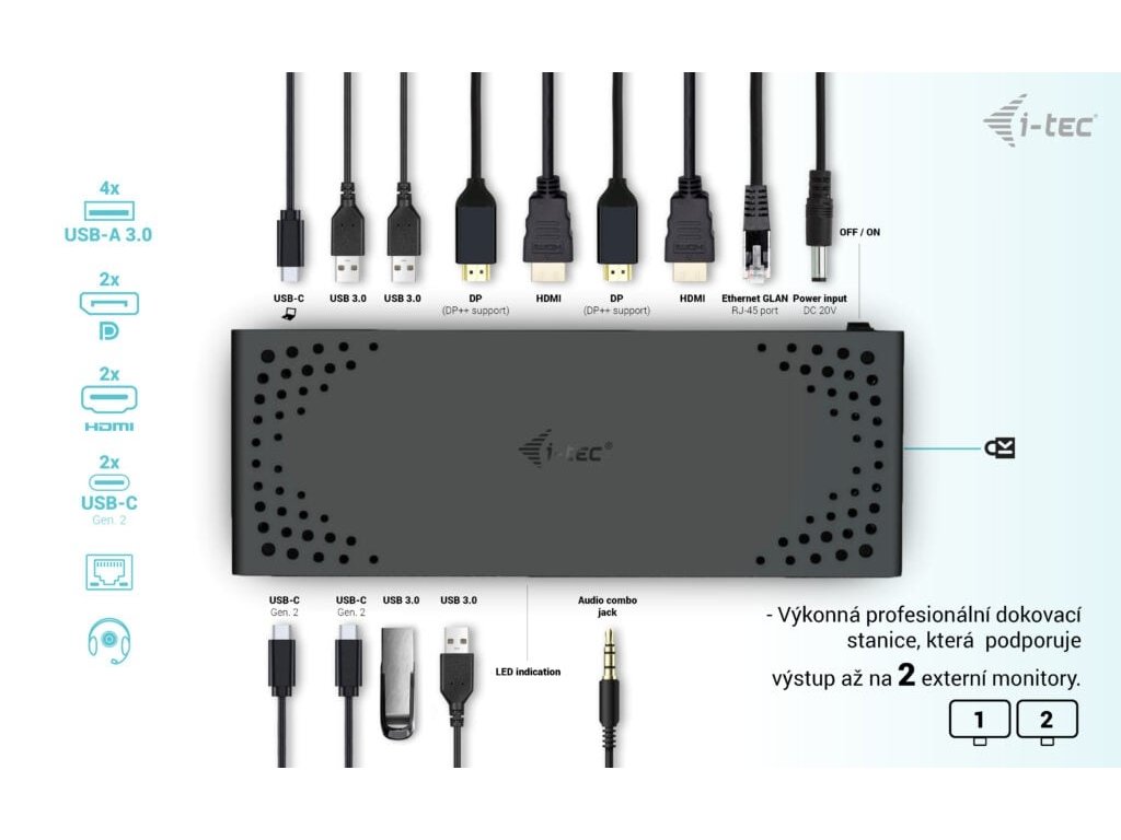 Výkonná kancelářská dokovací stanice s podporou superrychlých portů USB Gen 2. Dokovací stanice podporuje výstup až na dva externí monitory ve vysokém rozlišení až 4K. Dokovací stanici lze použít prakticky se všemi notebooky, protože podporuje připojení ke všem běžným portům: 3.0, USB-C a Thunderbolt“ 3/4 a zároveň podporuje všechny běžné současné operační systémy.