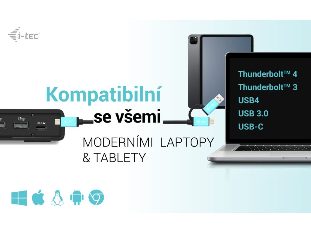 • Univerzální dokovací stanice kompatibilní s notebooky a tablety s rozhraním USB-C, USB-A a Thunderbolt.• 2x DisplayPort a 2x HDMI podporující až dva displeje 4K/60Hz (platí i pro platformu Apple M1/M2) nebo jeden displej 5K/60Hz.