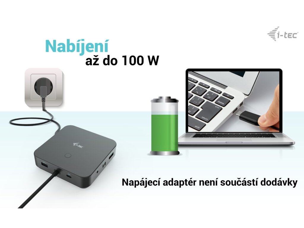 • Poznámka: Napájecí zdroj není součástí dodávky. Dokovací stanici lze používat s napájecím zdrojem dodávaným s notebookem nebo lze napájecí zdroj zakoupit samostatně, například i-tec CHARGER-C112W/UK Alternativně můžete zakoupit produkt C31TRI4KDPDPRO100/UK, který již obsahuje napájecí zdroj.