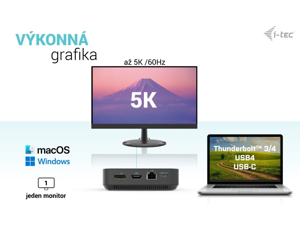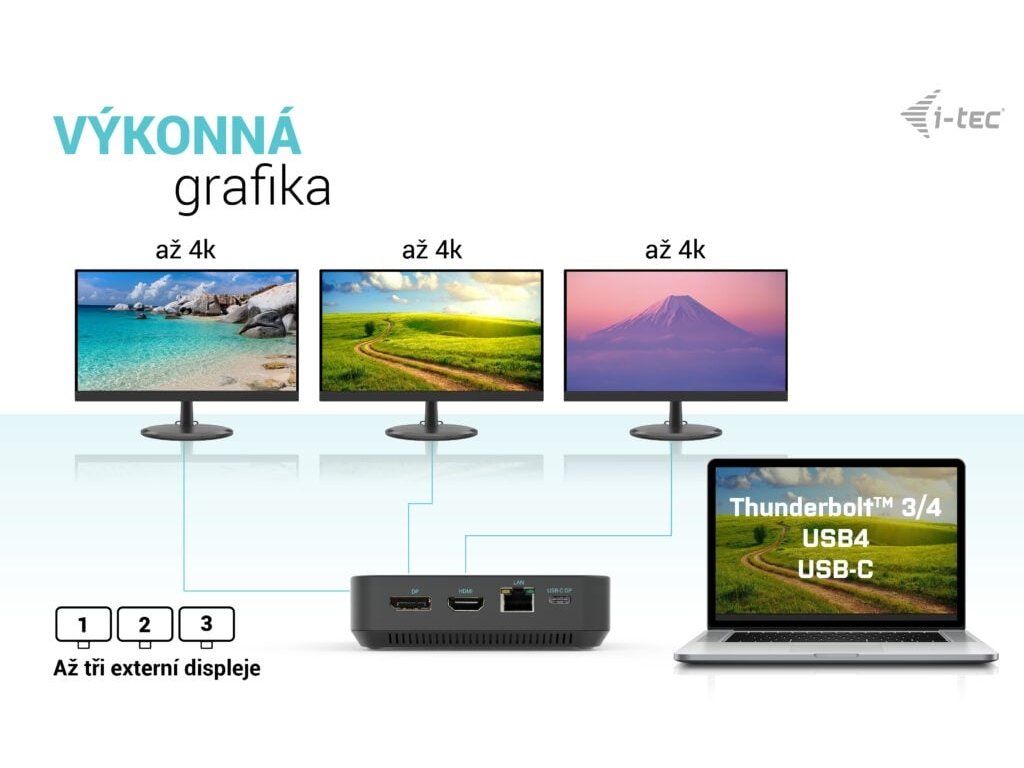 • Kompatibilní s notebooky a tablety s rozhraním USB-C, USB4 a Thunderbolt. (Hostitelské zařízení musí podporovat režim DisplayPort Alt).• 2x DisplayPort++ a 1x HDMI podporující až tři displeje 4K nebo jeden displej 5K/60Hz (v závislosti na výkonu notebooku). macOS podporuje pouze jeden rozšířený displej.