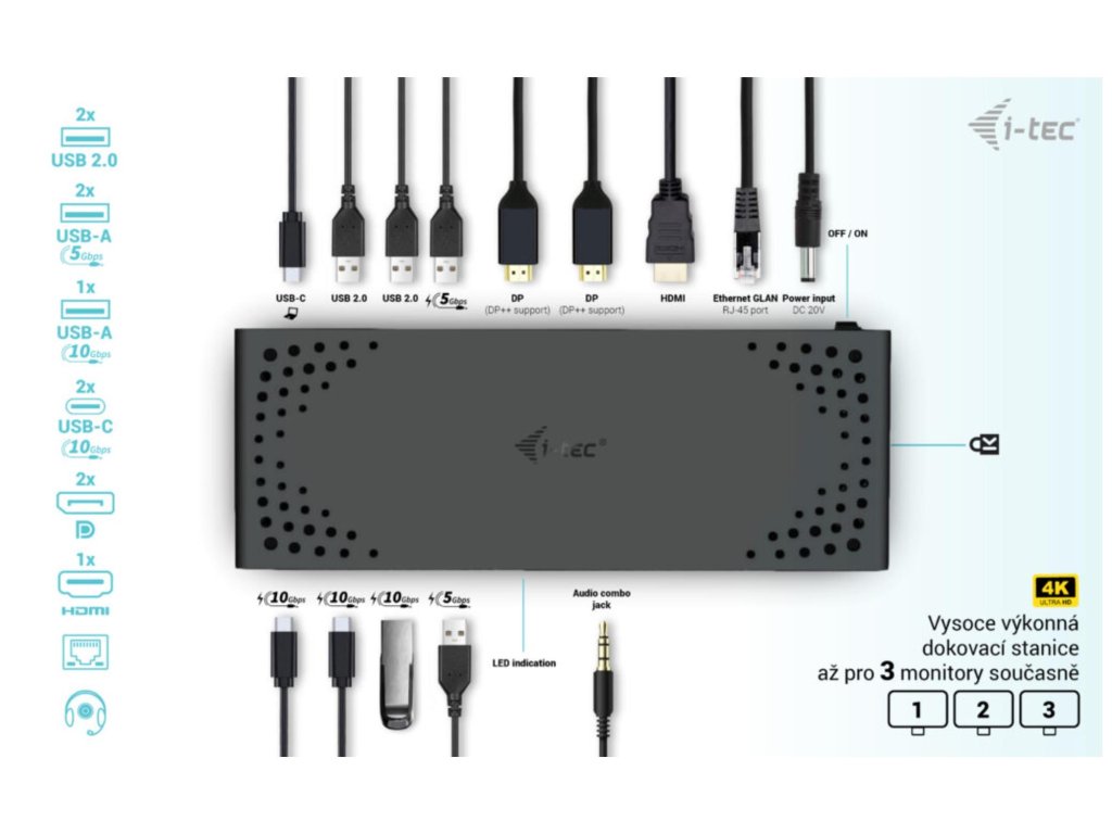 Vysoce výkonná dokovací stanice USB-C nové generace, která podporuje výstup až na tři externí monitory ve vysokém rozlišení až 4K. Dokovací stanici lze používat prakticky se všemi notebooky vybavenými porty USB-C, USB4 a Thunderbolt“ 3/4 a zároveň podporuje všechny běžné současné operační systémy.Dostatek portů USB (včetně těch podporujících rychlost Gen 2 až 10 Gb/s), spolehlivé a rychlé připojení k firemní síti díky integrovanému portu LAN a podpora instalace za monitor, to vše dělá z této dokovací stanice ideálního společníka pro opravdové profesionály. Samozřejmě podporuje nabíjení notebooku nebo tabletu, a to až do výkonu 100 W.