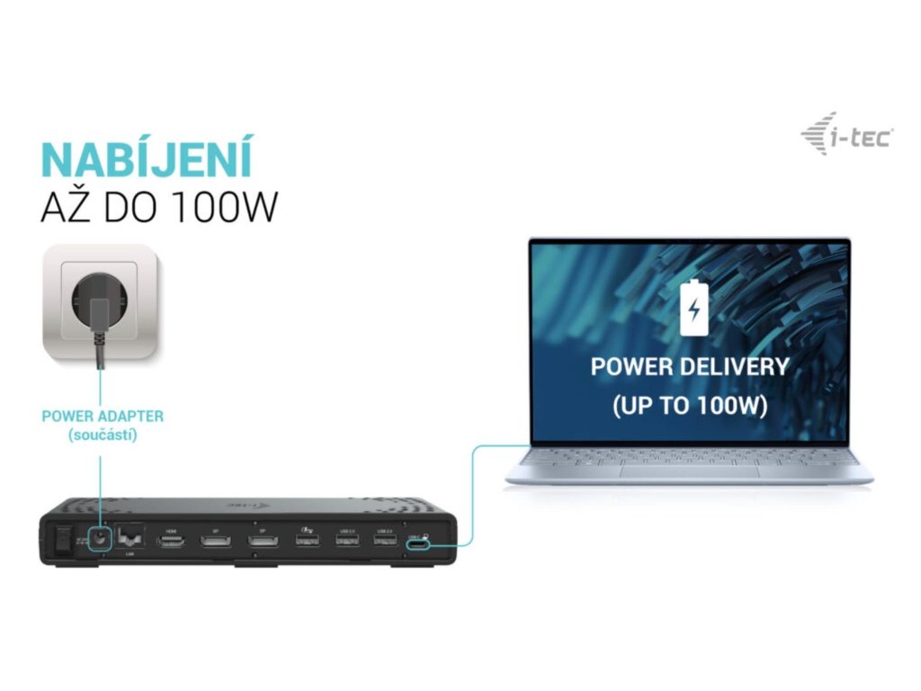 • Dokovací stanice podporuje až 100W napájení připojeného notebooku nebo tabletu.