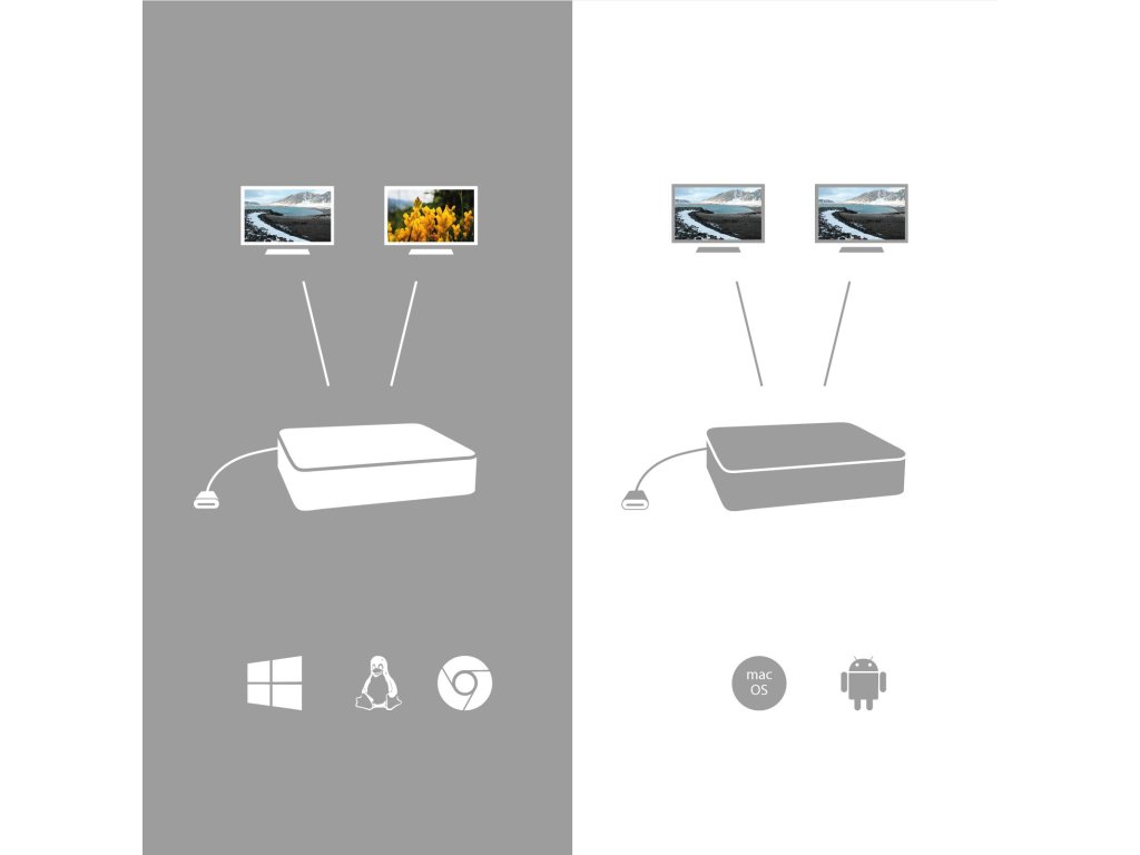 Operační systém macOS nepodporuje technologii více-obrazového video přenosu Multi Stream Transport (MST), což znamená, že v případě připojení k macOS bude na obou připojených monitorech promítnut stejný obraz.