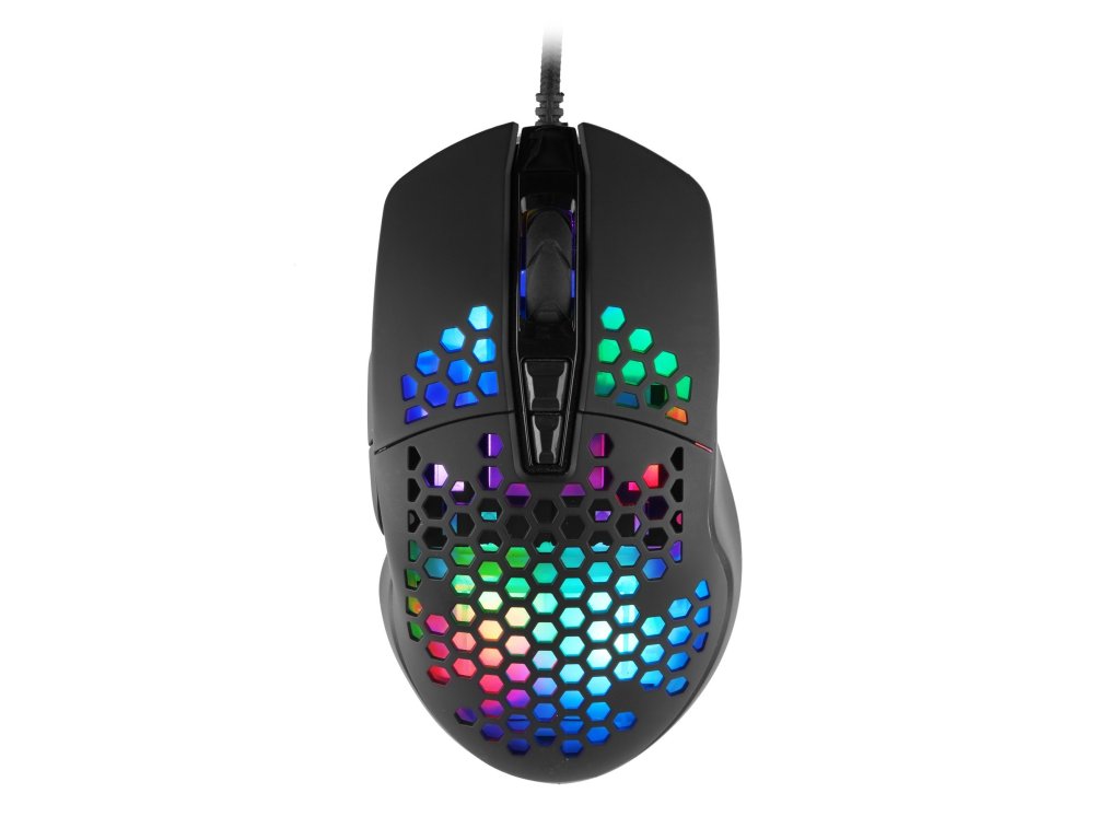 Herní myš C-TECH Scarab Vás na první pohled okouzlí svým elegantním tvarem a RGB podsvětlením. Myš disponuje optickým snímačem Instant 725F s maximálním rozlišením 7200DPI, které je možno pomocí tlačítka DPI měnit v 6 úrovních. Každá úroveň je při přepnutí signalizována 1s barevnou indikací. Myš je vybavena 5 tlačítky, které vám poskytnou dokonalou kontrolu nad hrou. Další dvě tlačítka jsou pro změnu DPI a volbu RGB režimu podsvětlení. 4 RGB módy s 16.8 miliony barev oživí váš stůl nejen při hraní her, ale i při kancelářské práci. Pohodlný úchop zajišťuje pogumovaný povrch horní části. Myš C-tech Scarab je díky své ergonomii vhodná pro praváky a k počítači ji připojíte 1,5m opleteným kabelem s USB konektorem.Specifikace :