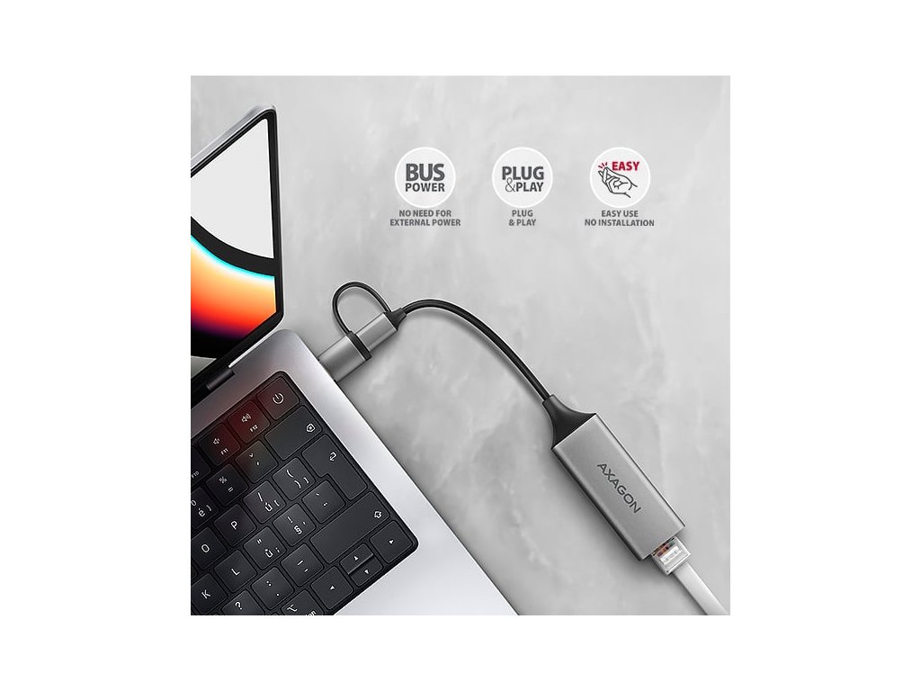 Kovový obal adaptéru je vyrobený z hliníku a zajišťuje tak dokonalou mechanickou ochranu a výborný odvod tepla. Díky kompaktním rozměrům a minimální hmotnosti je to ideální doplněk pro přenosné počítače a další mobilní zařízení. Podpora současných verzí operačních systémů Windows, macOS, Linux, Chrome OS nebo Android jej dovoluje použít pro jakýkoliv stolní počítač, notebook nebo ultrabook vybavený moderním oboustranným USB-C konektorem nebo klasickým USB-A konektorem. Ve Windows od verze 8.1 výše umožňuje adaptér snadnou automatickou instalaci bez nutnosti připojení k internetu. Ethernet adaptér využijí také uživatelé tabletů nebo mobilních telefonů podporujících možnost kabelového Ethernet připojení. Navíc je adaptér díky použitému čipu podporován i operačním systémem herních konzolí Nintendo Switch.