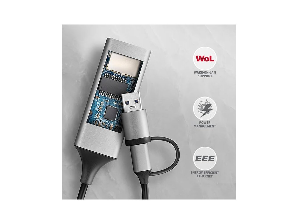 Externí síťová karta AXAGON ADE-TXCA snadno přemění USB-C nebo USB-A 3.2 Gen 1 port na Gigabit Ethernet port. Díky kabelu s USB-C koncovkou, na kterém je uchycena redukce USB-C -> USB-A tak připojíte Ethernet adaptér k jakémukoliv počítači, tabletu nebo telefonu. USB síťovka je kompatibilní s rychlostmi 10/100/1000 Mbit/s, rozšíří počítač o rychlé a stabilní síťové připojení, doplní chybějící síťový RJ-45 konektor, přidá další síťovou kartu nebo nahradí původní nefunkční síťové připojení.LAN adaptér nabízí kromě gigabitové propustnosti širokou škálu funkcí např. IPv4/IPv6 checksum pro snížení zátěže CPU kontrolními součty, crossover detekci a autokorekci, TCP large send offload, podporu různých módů Wake-on-LAN funkce, práce s VLAN nebo pokročilé funkce Power Managementu.