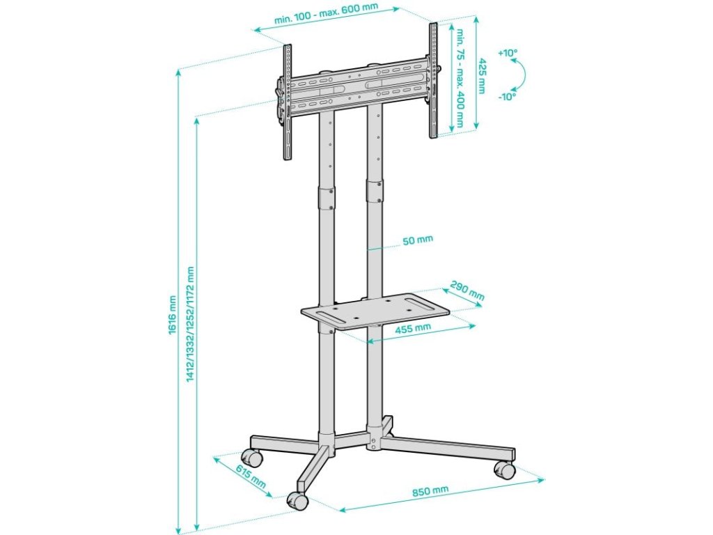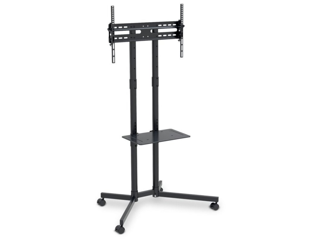 Velmi praktický pojízdný stojan je určen pro variabilní umístění TV kdekoliv v interiéru. Díky stojanu můžete přesouvat TV rychle a pohodlně kamkoliv podle potřeby. Navíc je vybaven praktickou poličkou na DVD, Set-top box atp. Robustní konstrukce z oceli unese spolehlivě až 40 kg obrazovku. Police má nosnost 10 kg. Stojan je kompatibilní s obrazovkami do úhlopříčky do 70" a pro nejvyšší možnou stabilitu je vybaven kolečky s brzdovou mechanikou proti nechtěnému pojezdu.