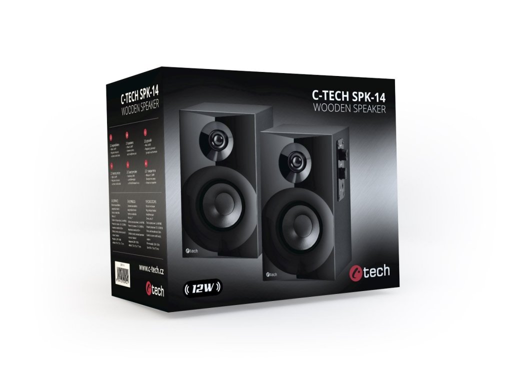 Dřevěné dvoupásmové reproduktory C-TECH SPK-14 jsou díky svému designu vhodné do moderně zařízených kanceláří nebo pokojů. Na bočním panelu reproduktorů se nachází ovládání hlasitosti a praktický výstup na sluchátka. Tato reprosoustava nabídne celkový výkon 12W RMS, což je dost i na kvalitní a hlasitý poslech hudby. Reproduktory jsou napájeny z elektrické sítě a k PC se připojují přes 3,5mm jack kabelSPECIFIKACE