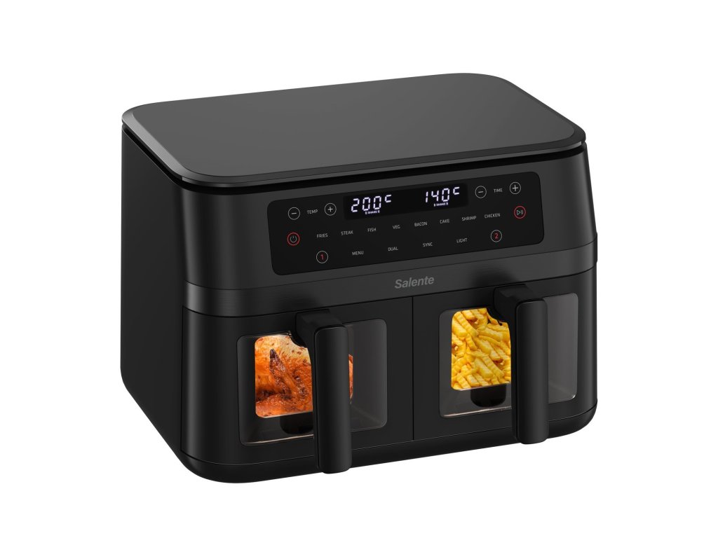 Představte si, že si doma připravujete křupavé hranolky, šťavnaté steaky nebo neodolatelný sladký dezert, a přitom si neděláte starosti s nezdravým tukem ani zbytečnými kaloriemi navíc. Horkovzdušná fritéza Salente DoubleAir převede tenhle sen v realitu. Místo ponoření do oleje totiž využívá horký cirkulující vzduch. Díky tomu vytváří na chystaných ingrediencích křupavou texturu, ovšem s minimem tuku. Umí fritovat i grilovat a k jejím výhodám patří i přítomnost dvou nezávislých fritovacích košů (s celkovým objemem 11 litrů) pro přípravu dvou různých pokrmů najednou. Z vaší kuchyně zkrátka vykouzlí místo, kde si opojné chutě a vůně podávají ruku se zdravým životním stylem.