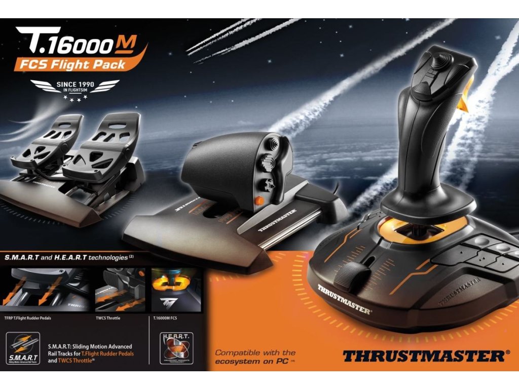 T.16000M FCS (Flight Control System) nabízí exkluzivní přesnou technologii H.E.A.R.T. - HALLEFFECT ACCURATE TECHNOLOGY™! + TWCS plynový pedál s technologií S.M.A.R.T. + T.Flight Rudder, první pedály se systémem S.M.A.R.T. posuvných kolejniček pro hladké řízení.T.16000M FCS