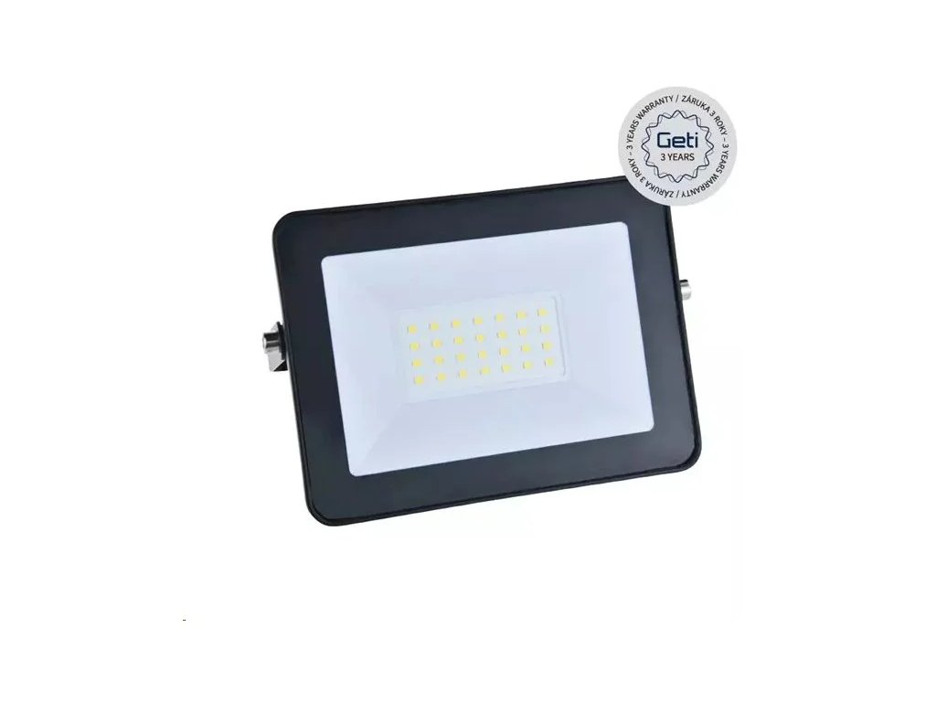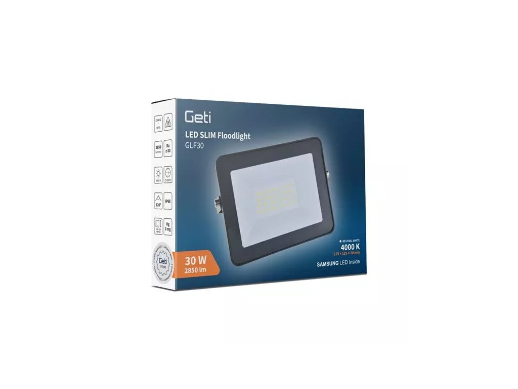 LED reflektor Geti GLF30 je plnohodnotnou náhradou halogenových reflektorů s úsporou až 70% energie. Po zapnutí svítí okamžitě v plné intenzitě. Je osazen výkonnými SAMSUNG diodami a proto dosahuje vysoké svítivosti. Jedná se o provedení SLIM což znamená, že reflektor je menší, tenčí a lehčí, díky čemuž je možné ho umístit téměř kamkoli. U reflektoru lze libovolně nastavit jeho polohu díky polohovatelnému držáku, který v sobě má již díry pro uchycení. LED reflektor je v celokovovém provedení s bezpečnostním sklem, je odolný proti dešti a vlhkému prostředí, proto najde uplatnění jak pro vnitřní tak i venkovní použití.Parametry produktu: