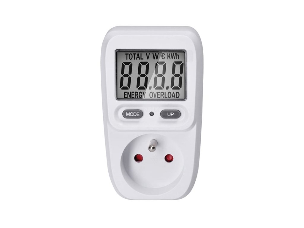 Digitální měřič spotřeby el. energieMěřič spotřeby elektrické energie s přehledným LCD displejem o úhlopříčce 2" (5 cm) umožňuje měření spotřeby až do 9999 kWh s příkonem v rozmezí 2W až 3680W/16A. Disponuje nastavením ceny za energii, dvěma tlačítky pro snadnou obsluhu, funkcí přesného výpočtu ceny a měření spotřeby. Obsahuje dětskou pojistku, indikaci překročení maximálního příkonu ("overload") a měří elektrické veličiny, jako je napětí a okamžitý odebíraný výkon. Integrovaný stabilizátor napětí zajišťuje přesnost měření s odchylkou do ±1,5 %. Pracovní teplota se pohybuje mezi 0 až +50 °C. Napájení je AC 230V, 50Hz.