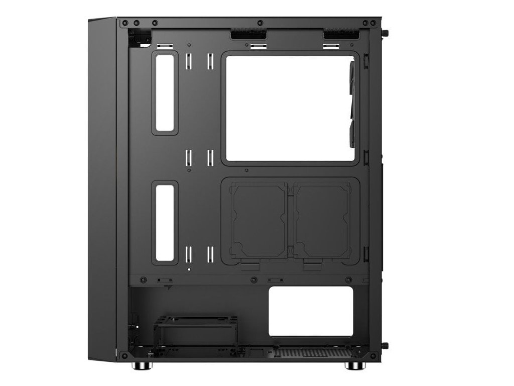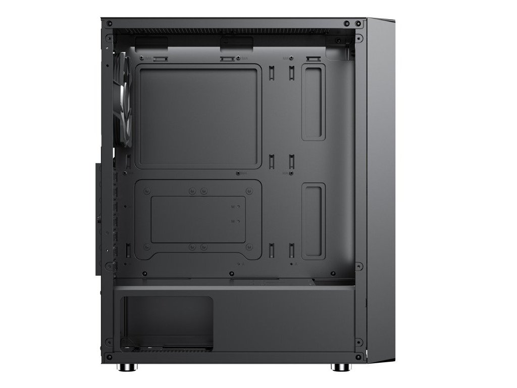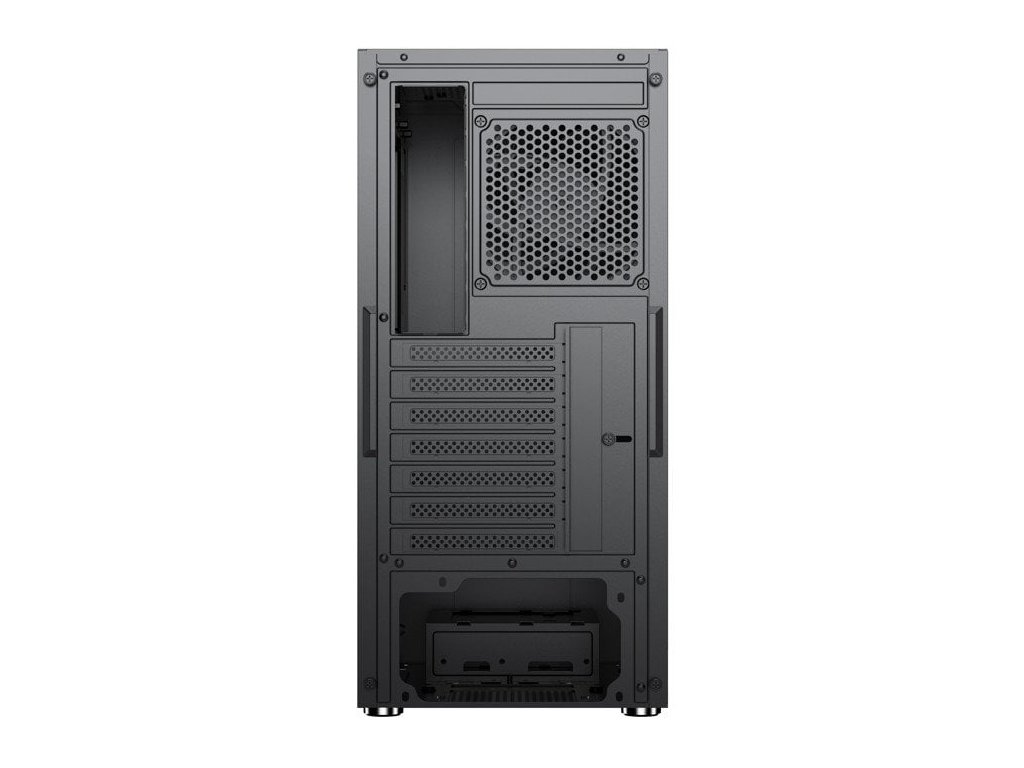 1*12cm fan zadní panel, osazen 1*12cm vybavený antivibračními podložkami a konektory Molex a 3pin pro připojení napájení do zdroje, nabo přímo na základní desku s řízením otáček