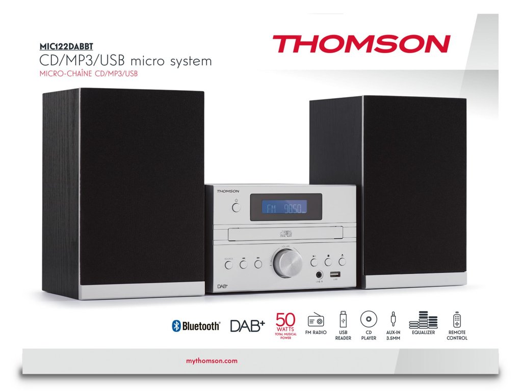 Thomson MIC122DABBT je mikrosystém, který udělá radost každému. Můžete poslouchat klasické rádio FM, nebo naladit nový formát DAB+. Přehrajete svoje CD, ale také hudbu uloženou na flash disku připojením do USB vstupu. Chcete přehrávat písničky uložené ve Vašem mobilu? Připojte se bezdrátově přes Bluetooth a pořádně to rozjeďte!Technické parametry: