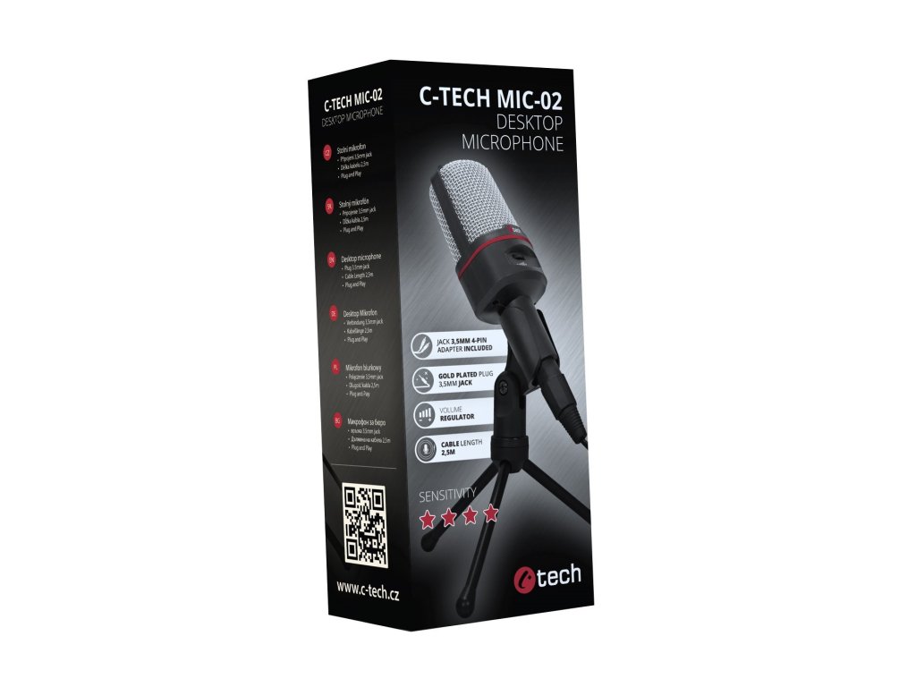 C-TECH MIC-02 je vysoce kvalitní mikrofon s přirozenou kvalitou reprodukce hlasu pro každodenní použití. Své uplatnění najde jak při použití s komunikačními programy, tak i při vytváření youtube videí nebo live přenosů. Mikrofon se připojuje pomocí 2,5m kabelu s pozlaceným stereo konektorem jack 3,5mm, v balení však naleznete i redukci jack stereo 3-pin/4-pin pro připojení mikrofonu k zařízení, které je vybaveno sloučeným audio konektorem pro mikrofon a sluchátka. Mikrofon je vybaven zapínacím tlačítkem s regulací hlastitosti. V balení naleznete praktický podstavec (tripod), díky kterému lze umístit mikrofon do různých poloh.Specifikace :