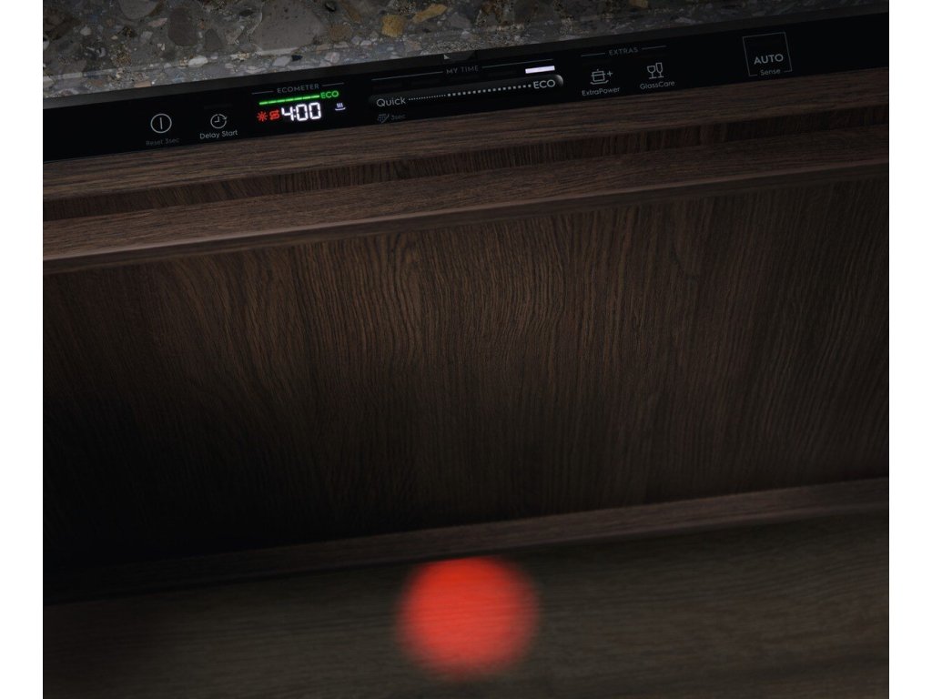 Myčka vás pomocí paprsku "Beam on floor" v tichosti informuje o aktuálním stavu mycího programu. Zvukovou signalizaci můžete snadno přeslechnout, ale světelný bod promítaný na podlaze pod spotřebičem nepřehlédnete. Když svítí červená, program běží, když zelená, je hotovo.