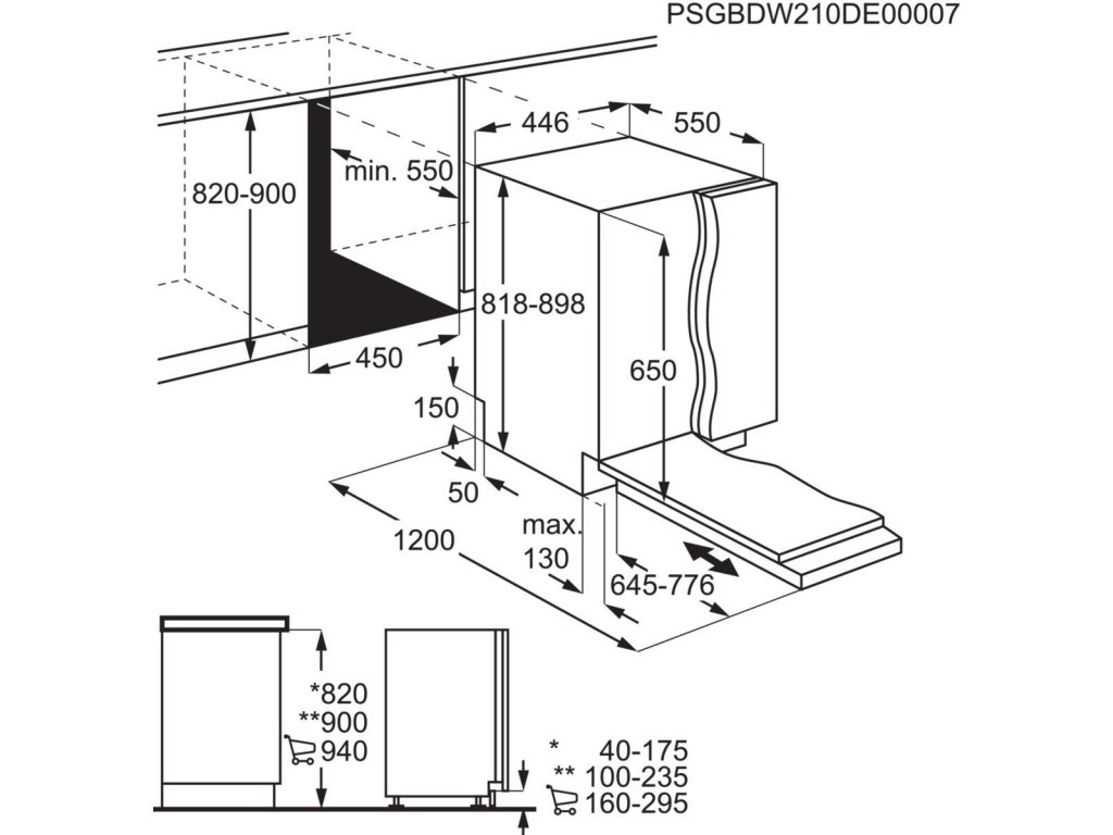 Třída energetické účinnosti: CTřída emisí hluku šířeného vzduchem: BÚroveň emisí hluku šířeného vzduchem (dB(A) re 1pW): 44Spotřeba energie na 100 cyklů (kWh): 59Jmenovitá kapacita (sad nádobí): 10Spotřeba vody na cyklus (lit.): 9.9Trvání programu (h:min): 4:30Pohotovostní režim (W): 0.5Index energetické účinnosti: 43.9Instalace: Vestavná, plně integrovaná (skrytý ovládací panel)Rozměry (mm): 818x446x550Prostor pro instalaci VxŠxH (mm): 820-900x450x550Délka přívodního kabelu (m): 1,5Délka napouštěcí hadice (cm): 150Programy: 160 minutový, 60 minutový, 90 minutový, AutoSense, eco, Machine Care, rychlý 30 minutový, Opláchnutí a čekáníDélka vypouštěcí hadice (cm): 150Příkon (W): 1550-2200Napájecí napětí (V): 200-240