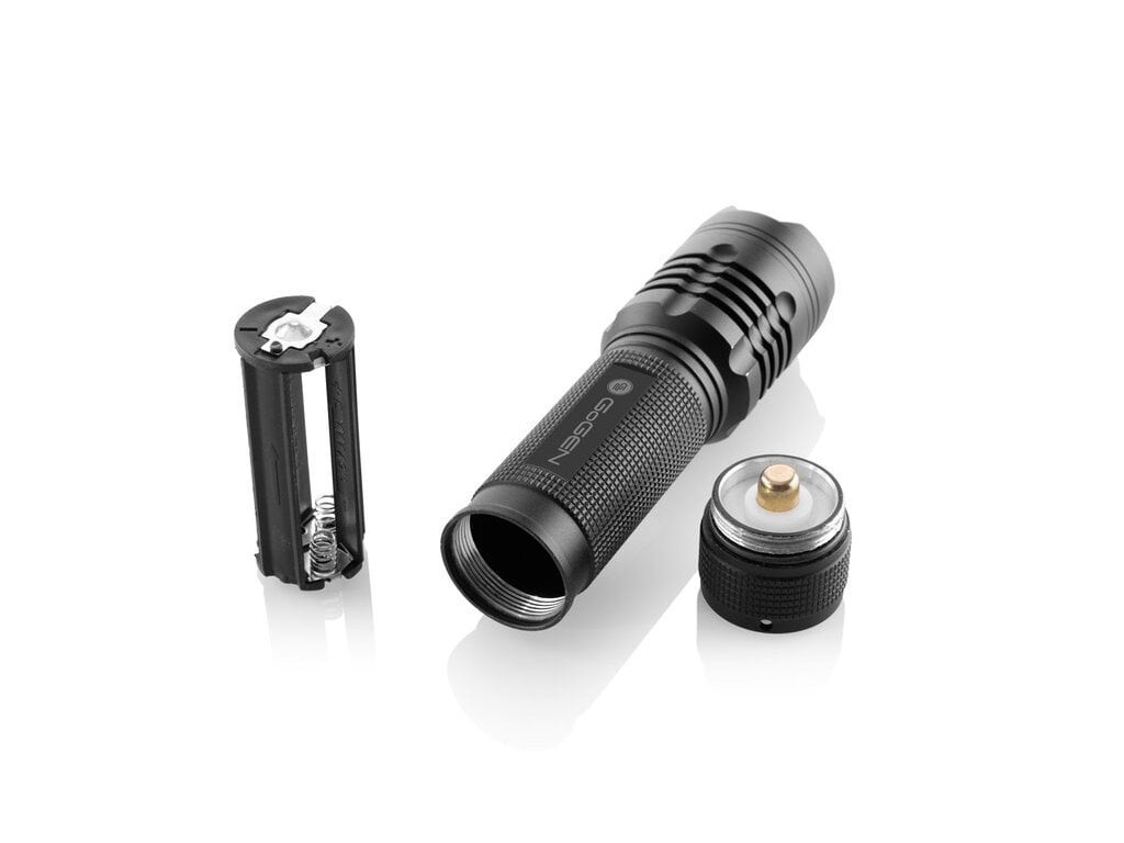 Ruční outdoorová svítilna GoGEN FL01BKompaktní svítilna, která je napájena třemi mikrotužkovými bateriemi AAA. V závislosti na typu použitých baterií vydrží svítit až 8 hodin. Pomocí tlačítka zapnutí lze volit mezi třemi režimy svícení – světlo s vysokou intenzitou, nízkou intenzitou nebo i režim blikání. Otáčením přední části svítilny lze upravovat rozptyl světla.
