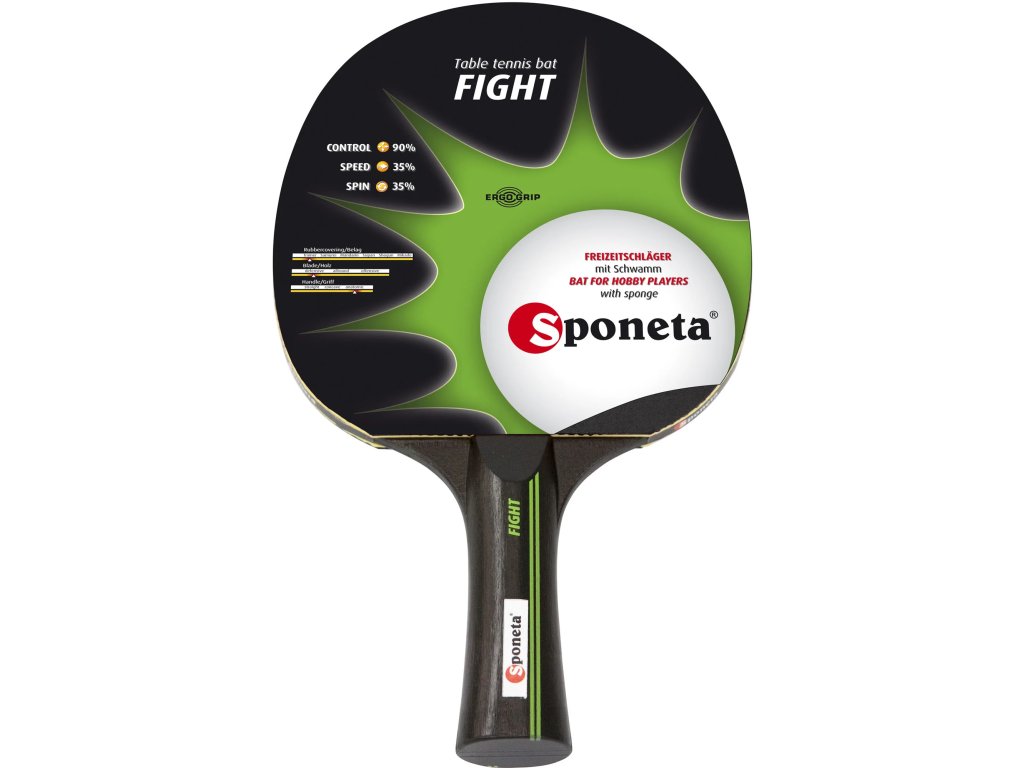 Pálka na stolní tenis SponetaFight s tvarovanou anatomickou rukojetí je vhodná pro lepší rekreační hráče. Výška mechového potahu je 1,0 mm, základní rám pálky je vhodný spíše pro obrannou hru. Balení pálky je ve folii s barevnou kartou vloženou pod folii. Vlastnosti pálky: spin-35% speed - 35 % control - 90%Doplňkové parametry