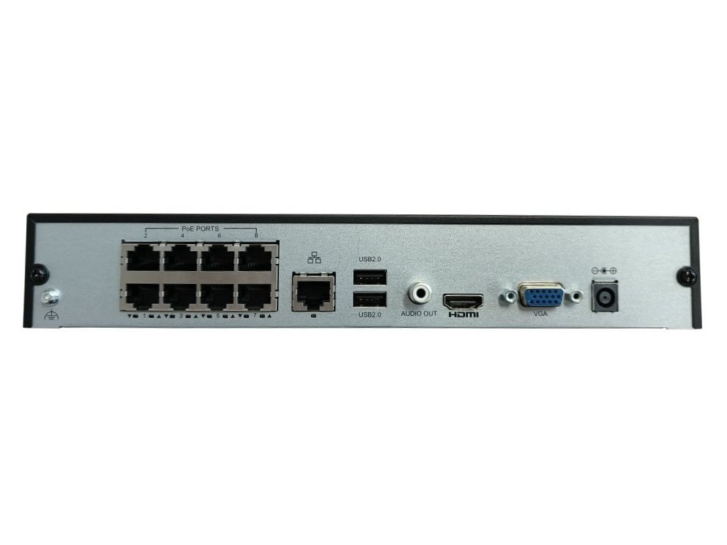 Porty: 1× HDMI 4K výstup, 1× VGA Full HD výstup, 2× USB 2.0, 8× RJ-45 (PoE podpora), 1× RJ-45 (10/100 Mbps), 1× audio výstup (RCA)