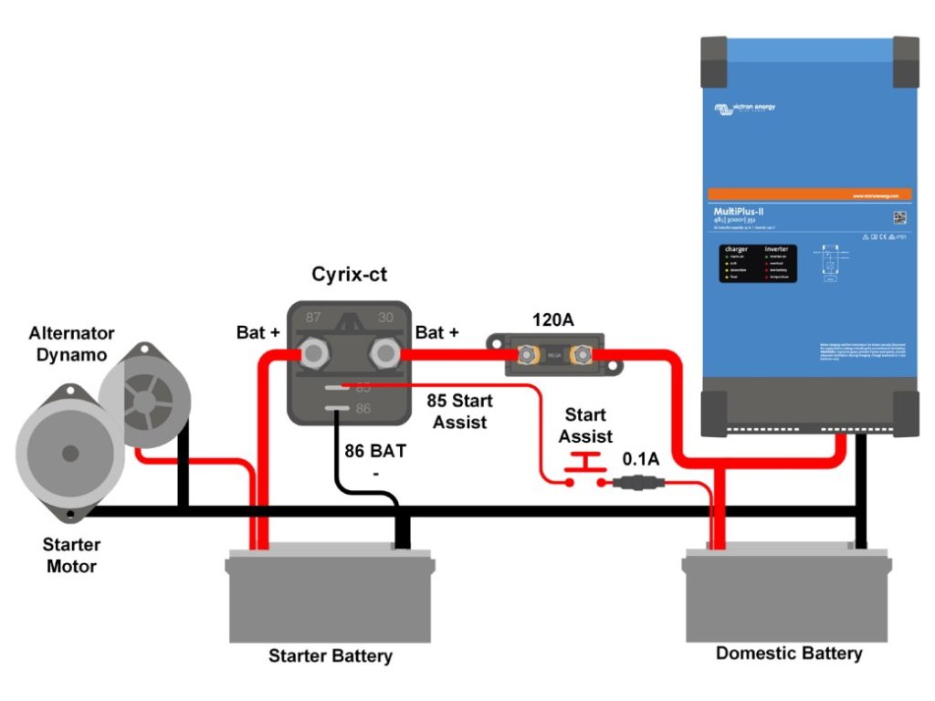 Inteligentní propojovač baterií Cyrix-ct řídí nabíjení a odpojování startovací a provozní baterie. Pokud je na jedné z baterií dosaženo napětí 13,0 V (26 V) po dobu 10 minut nebo 13,8 V (27,6 V) po dobu 4 sekund, Cyrix-ct baterie propojí a dochází k nabíjení obou baterií současně do plně nabitého stavu. Jakmile na jedné z baterií klesne napětí pod 12,8 V (25,6 V) po dobu 10 minut nebo 11,8 V (23,6 V) po dobu 4 sekund, dojde k vzájemnému odpojení baterií. Toto propojování a odpojování funguje obousměrně. Baterie mohou být odlišných kapacit, typů a konstrukcí. Předpokládá se, že každá baterie napájí své vlastní spotřebiče.