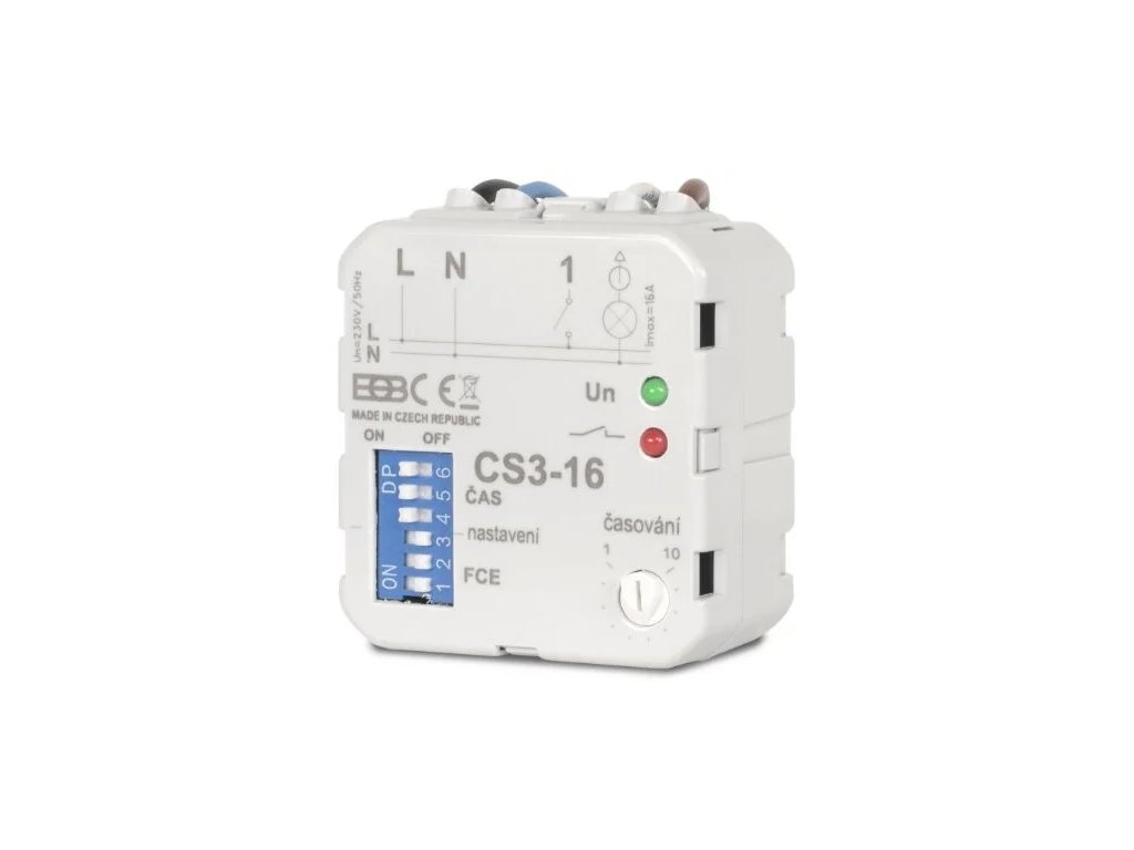 Vlastnosti CS3-16:je multifunkční časové relé pro ovládání odporové (žárovky) a indukční zátěže (ventilátory) s možností montáže POD VYPÍNAČ , spínacím prvkem je silové relé 16A.