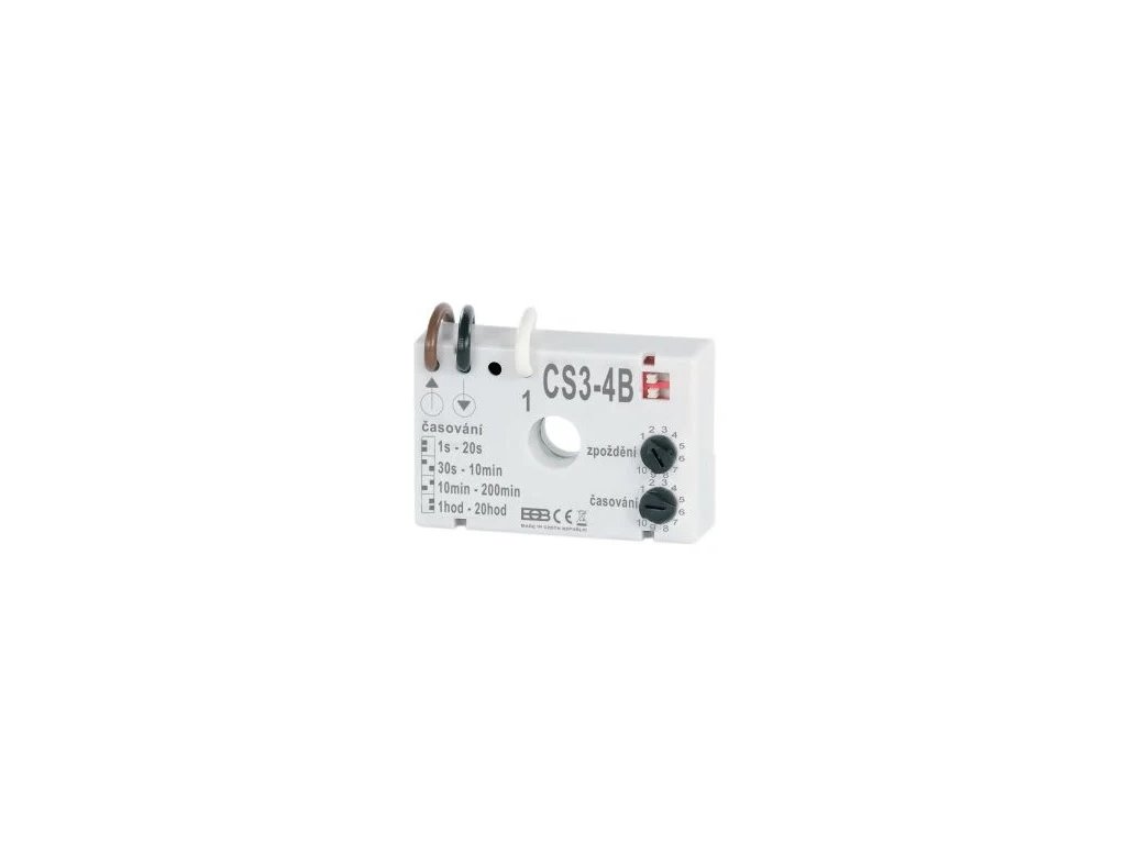 Vlastnosti CS3-4B:slouží ke zpožděnému zapnutí a vypnutí ventilátoru v závislosti na osvětlení. Velkou výhodou je ZAPOJENÍ BEZ NULOVÉHO VODIČE! Ke spuštění ventilátoru dojde 30s až 10min po zapnutí osvětlení. Nastavení se provádí trimrem P1(zpoždění), pomocí malého šroubováku. K odpojení ventilátoru dojde v době 1s až 20h po vypnutí osvětlení.