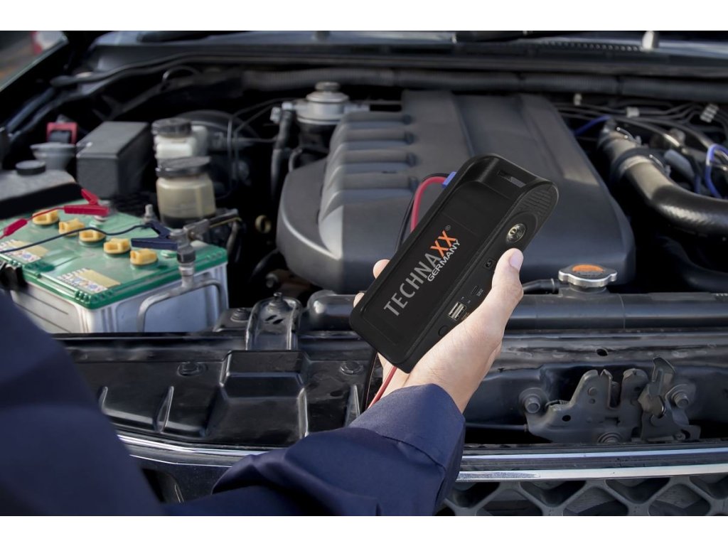 Technaxx Jump Starter, Powerbanka 3-v-1, 10000mAh - pro nouzové nastartování auta, nabíjení (např. Chytrého telefonu/Tabletu/PC/atd.) a nouzové světlo.• Jump starter s 10000mAh lithium-zelezo-fosfatovou baterií
