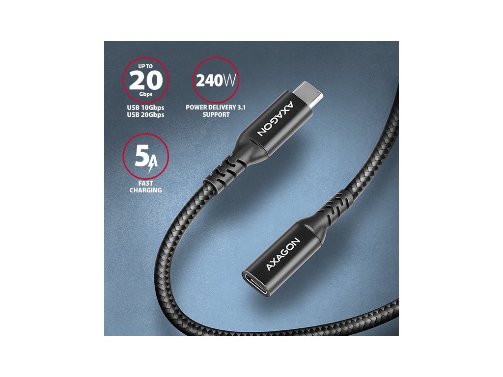 Prémiový prodlužovací USB-C USB-C datový a nabíjecí AXAGON BUCM32-CF15AB SPEED+ EXTENSIONS USB 3.2 Gen 2 kabel s konektory USB-C male a USB-C female. Kabel je navržen pro velmi rychlé datové přenosy, přenos videa a nabíjení notebooků, telefonů, tabletů a dalších mobilních zařízení. Umožnuje vysokorychlostní prodloužení pro zařízení s krátkým kabelem např. multiportové huby a replikátory portů. Nebudete tak limitováni prostorem a umístěním portů na notebooku.Kabel podporuje přenos dat rychlostí až 20 Gb/s, také umožňuje přenášet obraz až do rozlišení 8K/60Hz Full Ultra HD a zvuk. Kabel je kompatibilní s nabíjecími technologiemi Power Delivery až 240W (záleží na prodlužovaném kabelu), Quick Charge, Samsung AFC, Huawei FCP, SMART a dalšími. Připojené zařízení lze nabíjet proudem až 5A.