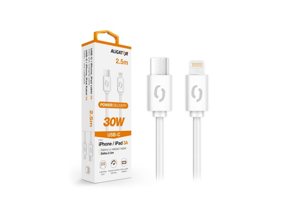 Datový kabel ALIGATOR POWER 30W, USB-C/Lightning 3A, 2,5m bílý (DATKP61)