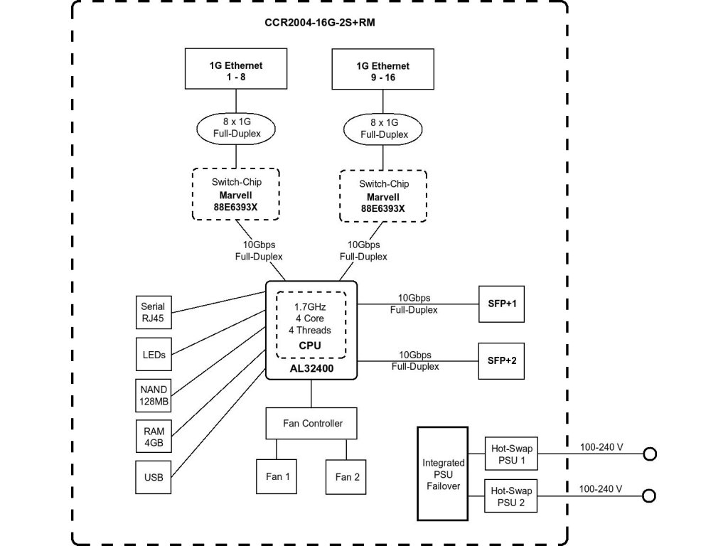 CCR2004-16G-2S+ je router do 19" racku z nové řady CCR routerů, která přichází s nejvyšším poměrovým výkonem na 1 jádro ze všech CCR, což je nejdůležitější aspekt, pokud jde o náročnější operace založené na processing per-connection (např. QoS). Router je poháněn CPU s 64bit ARM architekturou s taktem 1700 MHz, má 4GB RAM typu DDR4 a 128MB NAND uložiště.Router disponuje 16× Gigabit LAN, 2× SFP+ slot (možnost zapojit 1G i 10G moduly), plnohodnotným USB 3.0 a sériovým portem typu RJ45. Na zadní straně má router dva ventilátory a 2 redundantní zdroje.