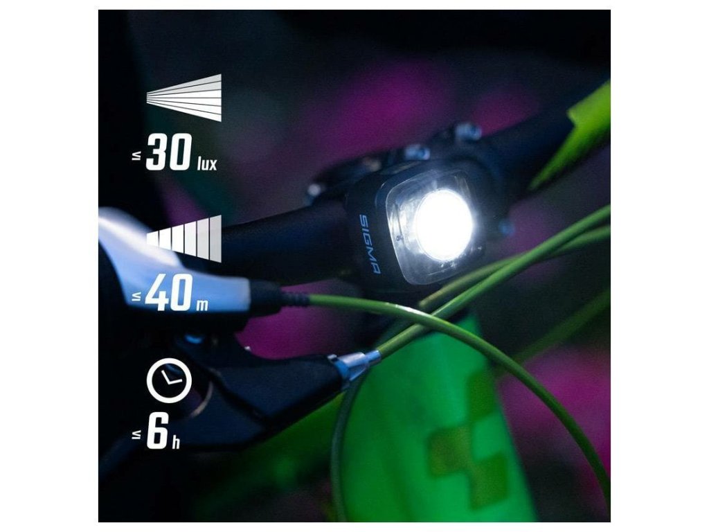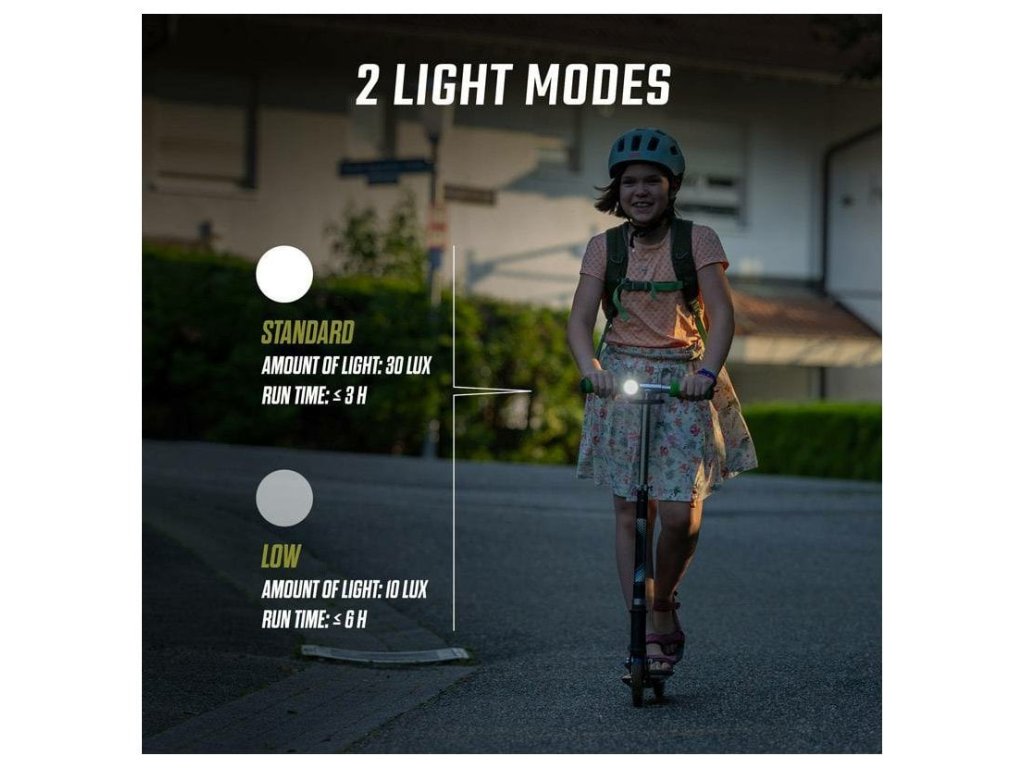 Přední světlo AURA MICRO nabízí dva režimy svícení. Ve vysokém režimu poskytuje plný jas, který je ideální ve tmě nebo za špatných podmínek viditelnosti. V nízkém režimu šetří energii a je ideální pro kratší vzdálenosti nebo osvětlené cesty. Baterie vydrží až 6 hodin.