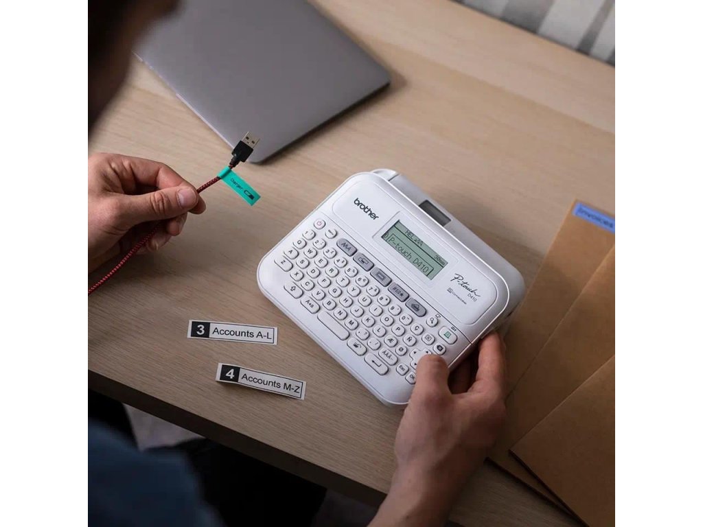 Tiskárna štítků připojitelná k počítači pro domácnost a kancelářVybavte se profesionální tiskárnou štítků Brother. Model PT-D410 je kompaktní, snadno použitelná tiskárna, která produkuje profesionální laminované štítky pro označení důležitých souborů a složek, identifikaci vybavení, označení kabelů domácí kanceláře a pro uspořádání úložných boxů. Pokud si uděláte čas na pečlivé označení vaší domácí kanceláře, výsledkem bude přehledný pracovní prostor, který zvýší celkovou produktivitu a umožní vám plně se soustředit se na aktuální práci.
